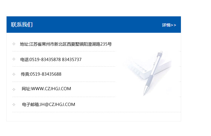 地址:常州市新北區友邦商務大廈1幢16、17層  電話:0519-85101652  傳真:0519-85112595  郵編:213022  網址:www.cz-jiayue_cn.xbfzl.com  郵箱:xiajifengaa@163.com